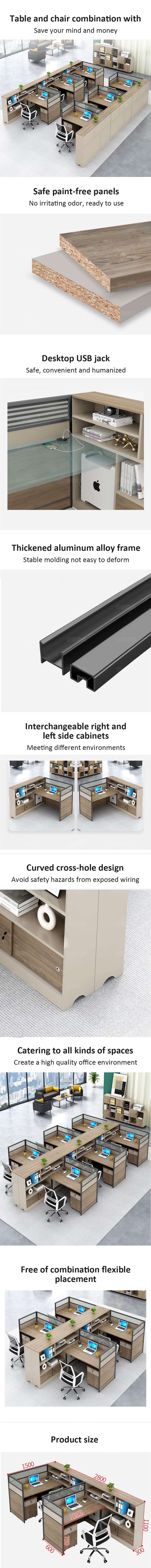 L shaped staff desk with tall cabinet and screen, office desk and chair combination
